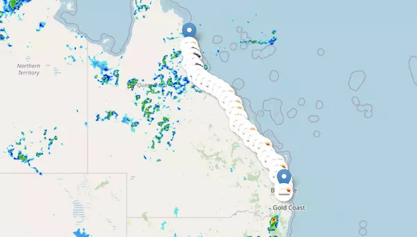The A1 Bruce Highway starts at Cairns, QL, and ends at Brisbane, QL, passing through Townsville, Mackay, Rockhampton, and Sunshine Coast.