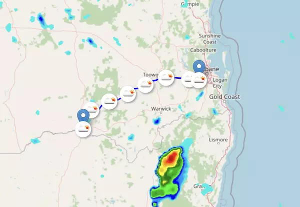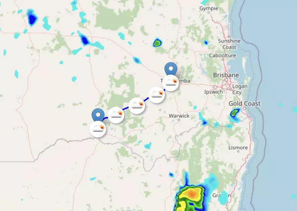 The A2 Warrego Highway starts at Charleville, QL, and ends at Riverview, QL, passing through Morven, Roma, Miles, and Toowoomba.