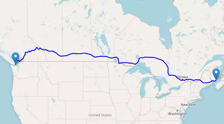 The Trans-Canada Highway reaches coast-to-coast from Victoria, British Columbia, to St. John, New Brunswick.