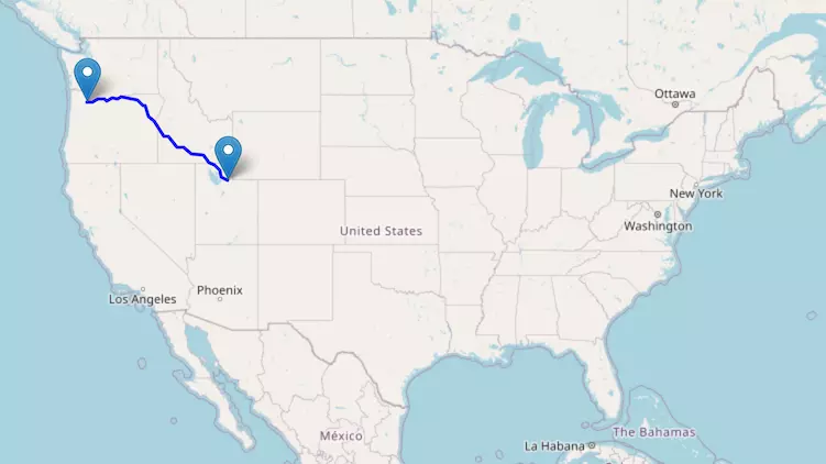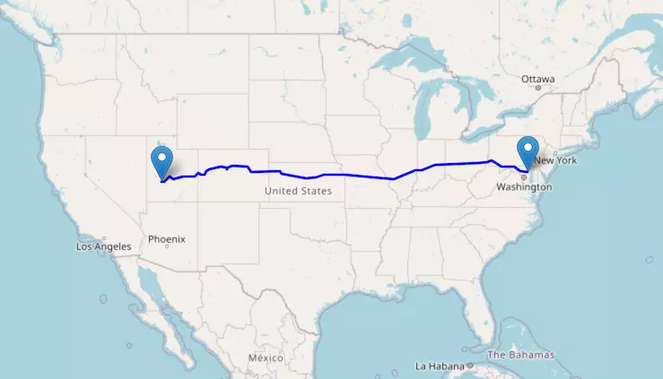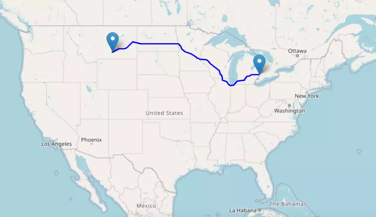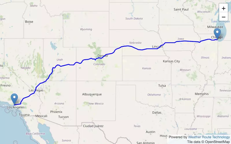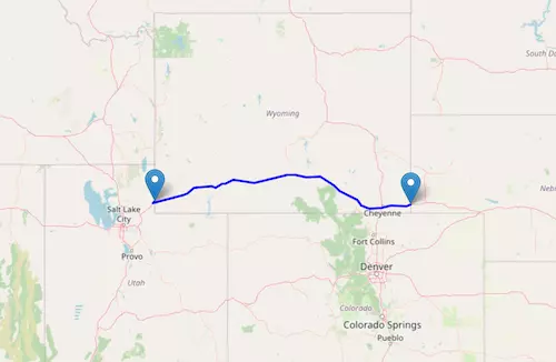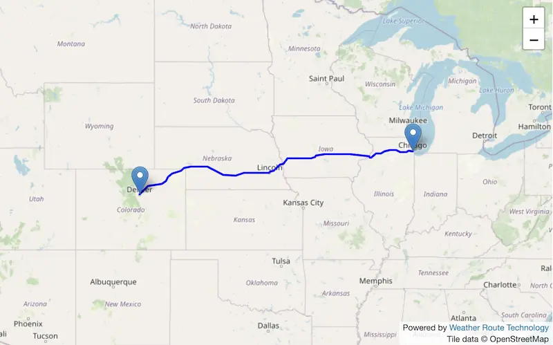 The route from Chicago to Denver starts in Illinois, passes through Iowa and Nebraska along I-80W, and ends in Colorado.