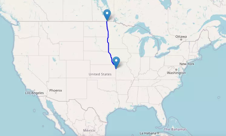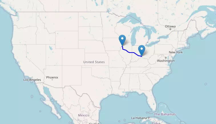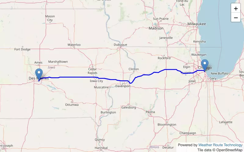 The route from Chicago to Des Moines starts in Illinois and ends in Iowa.