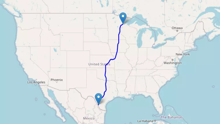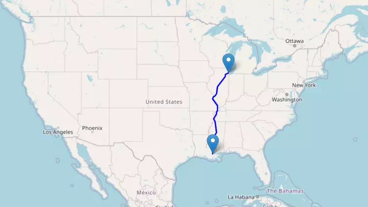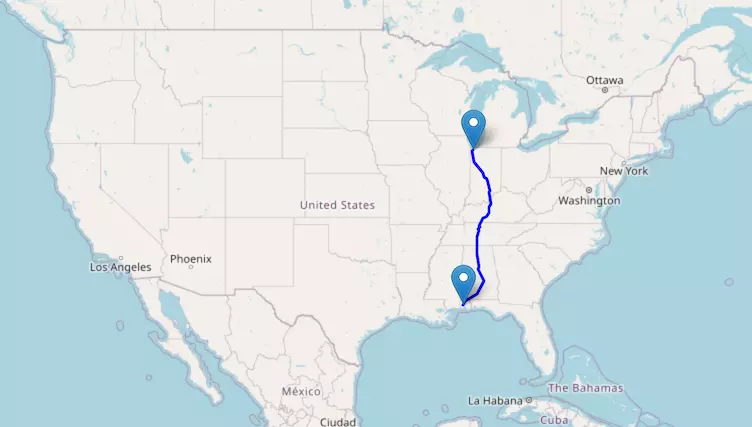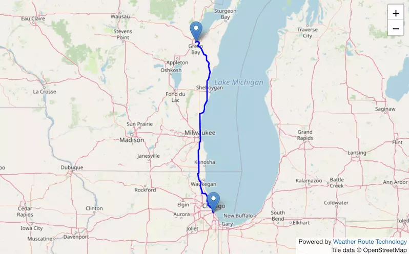 The route from Chicago to Green Bay starts in Illinois and ends in Wisconsin.