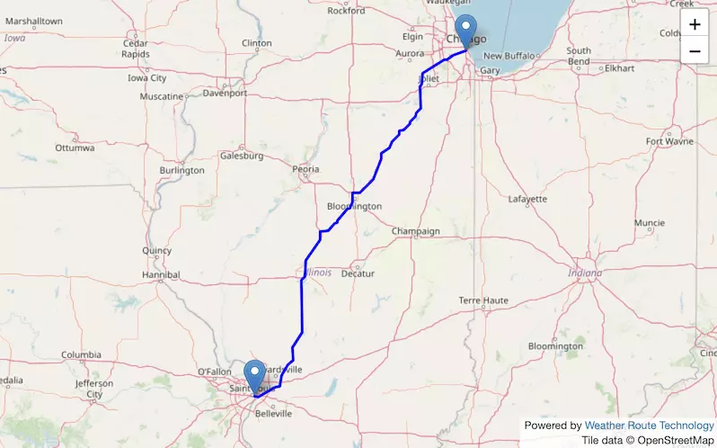 The route from Chicago to St. Louis starts in Illinois and ends in Missouri.
