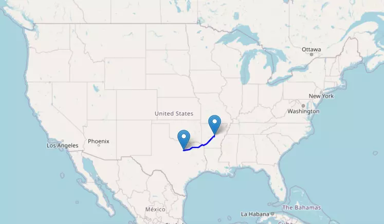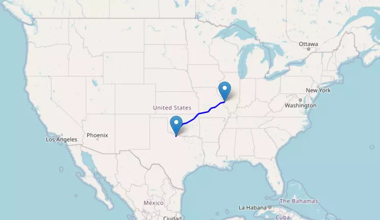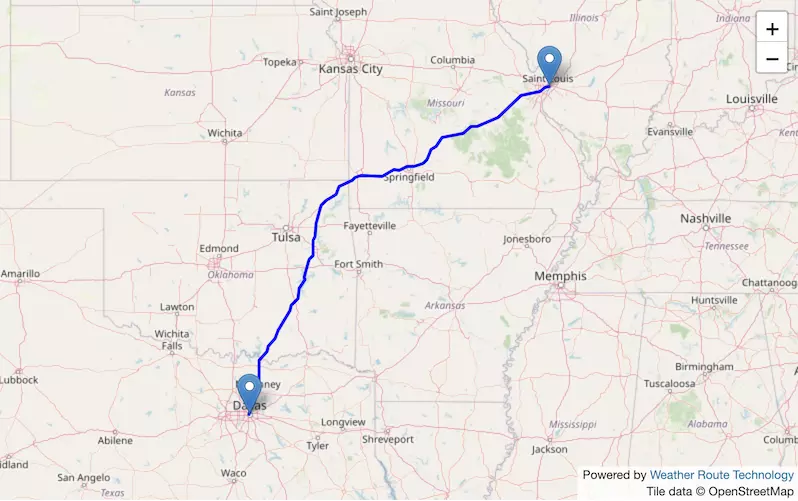 The route from Dallas to St. Louis starts in Texas, passes through Arkansas, and ends in Missouri.