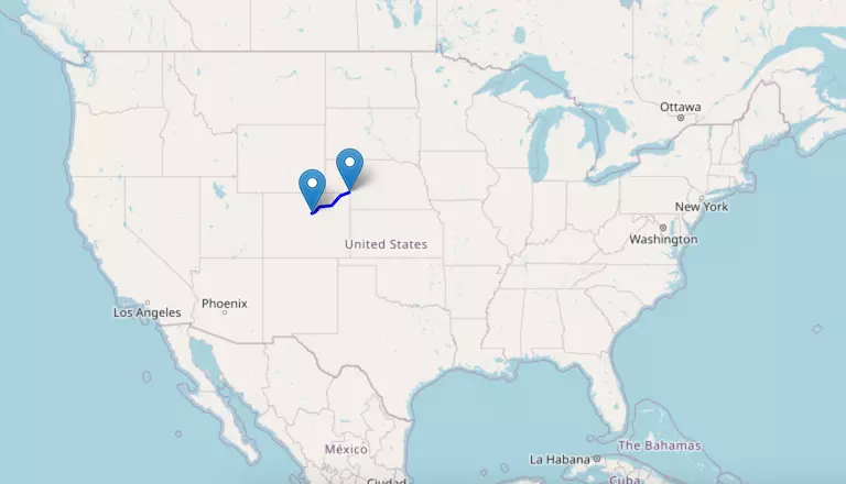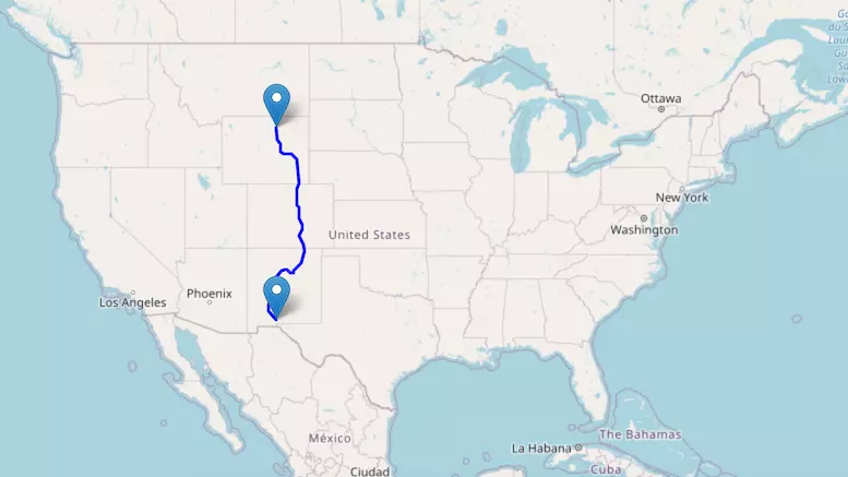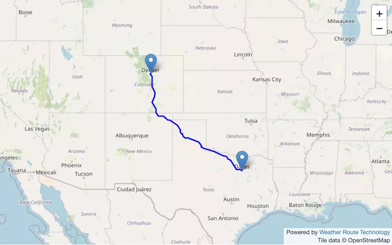The route from Denver to Dallas starts in Colorado, passes through Kansas and Oklahoma, and ends in Texas.