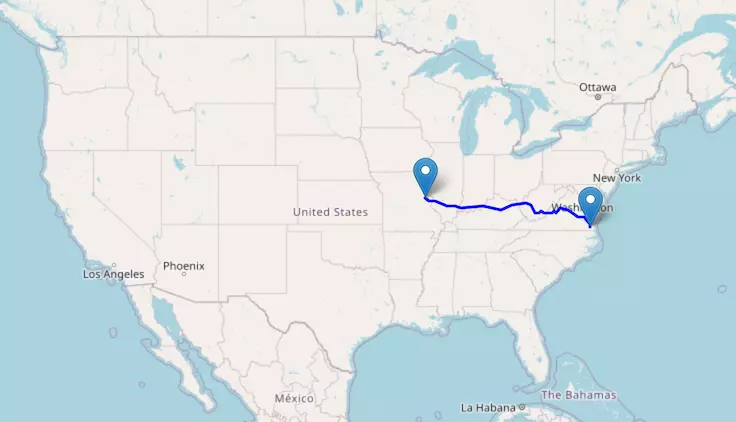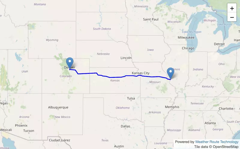 The route from Denver to St. Louis starts in Colorado, passes through Kansas, and ends in Missouri.