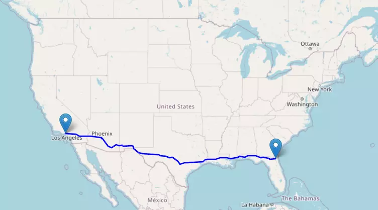Interstate I-10 reaches from California to Florida and passes through Arizona, New Mexico, Texas, Louisiana, Mississippi, and Alabama.