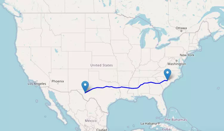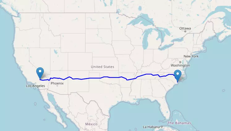 Interstate I-40 reaches from California to North Carolina and passes through Arizona, New Mexico, Texas, Oklahoma, Arkansas, and Tennessee.