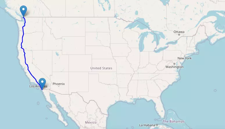 Interstate I-5 reaches from Canada to Mexico and passes through Washington, Oregon, and California.