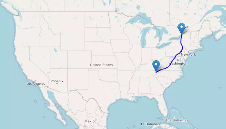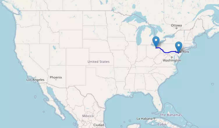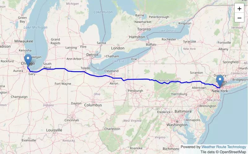 The route from New York to Chicago starts in New York, passes through New Jersey, Pennsylvania, Ohio, Indiana, and ends in Illinois.