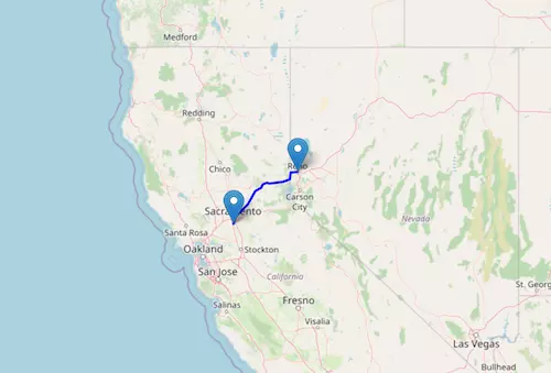 This segment of interstate I-80 reaches from Reno, Nevada to Sacramento, California, crossing Donner Pass.