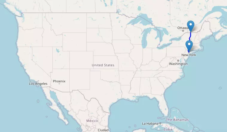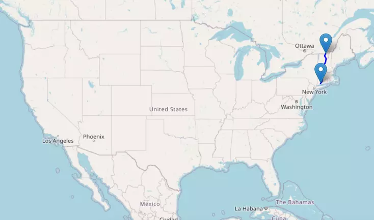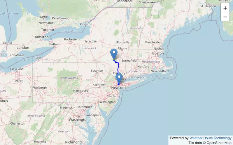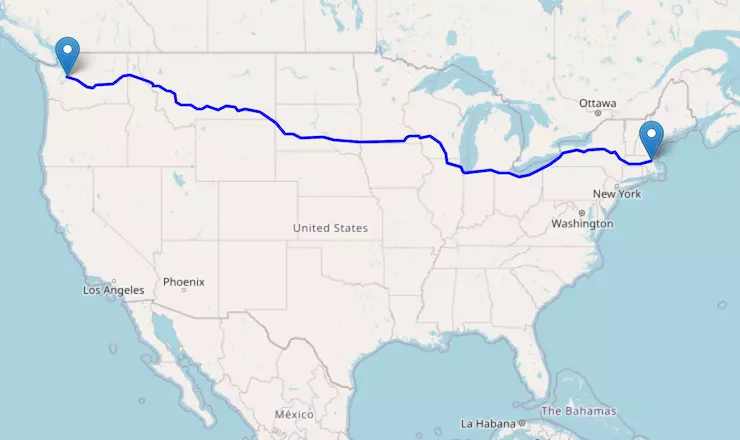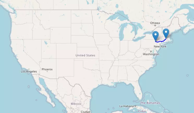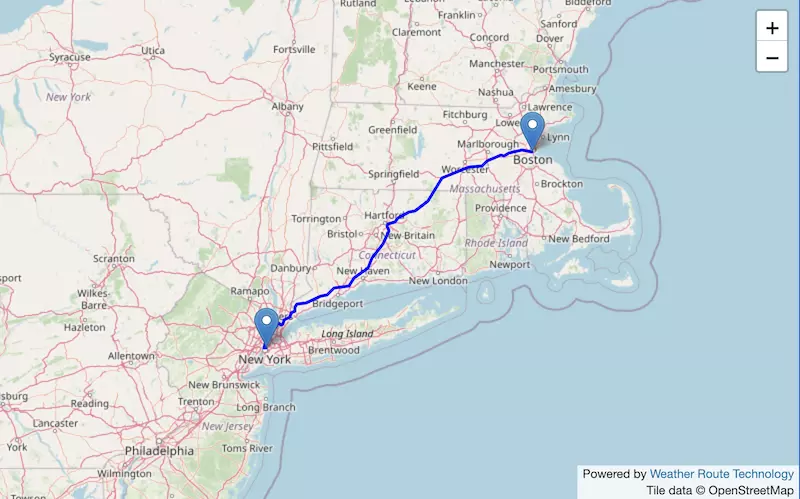 The route from New York to Boston starts in New York, passes through Connecticut, and ends in Massachusetts.
