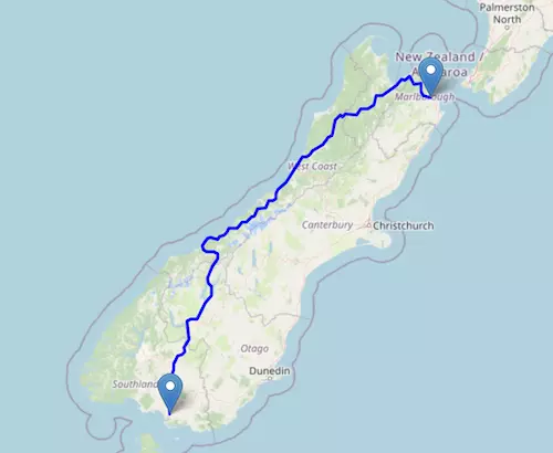 The SH 6 Motorway starts at Blenheim and ends at Invercargill, passing through Nelson, Greymouth, Haast, Wānaka, and Queenstown.