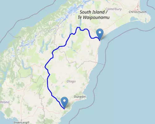 The SH 8 Motorway starts at Timaru and ends at Milton, passing through Lake Tekapo, Omarama, Cromwell, Alexandria, and Millers Flat.