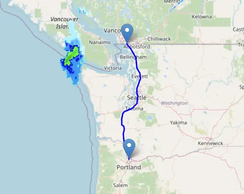 Interstate I-5 in Washington reaches from Canada to Portland, Oregon.