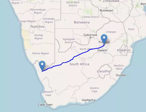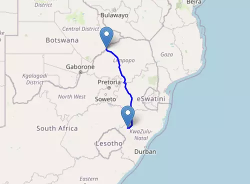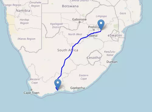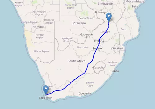 The National Route N1 starts at the border of Zimbabwe and ends at Cape Town, passing through Polokwane, Pretoria, Johannesburg, Kimberley, and Beaufort West.