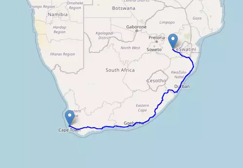 The National Route N2 starts at Cape Town and ends at Ermelo, passing through George, Gqeberha, East London, Durban, and Richards Bay.