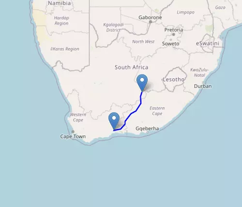 The National Route N12 starts at Emalahleni and ends at George, passing through Johannesburg, Klerksdorp, Kimberley, Britstown, Beaufort West, and Oudtshoorn.